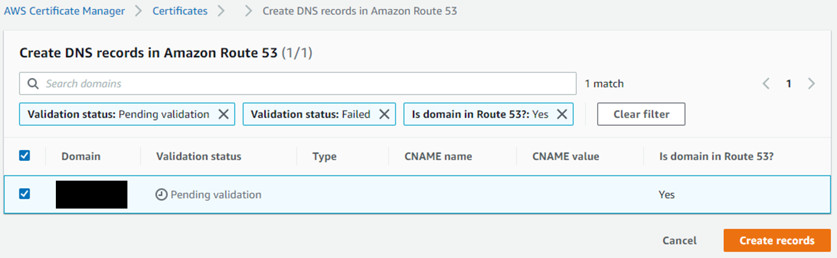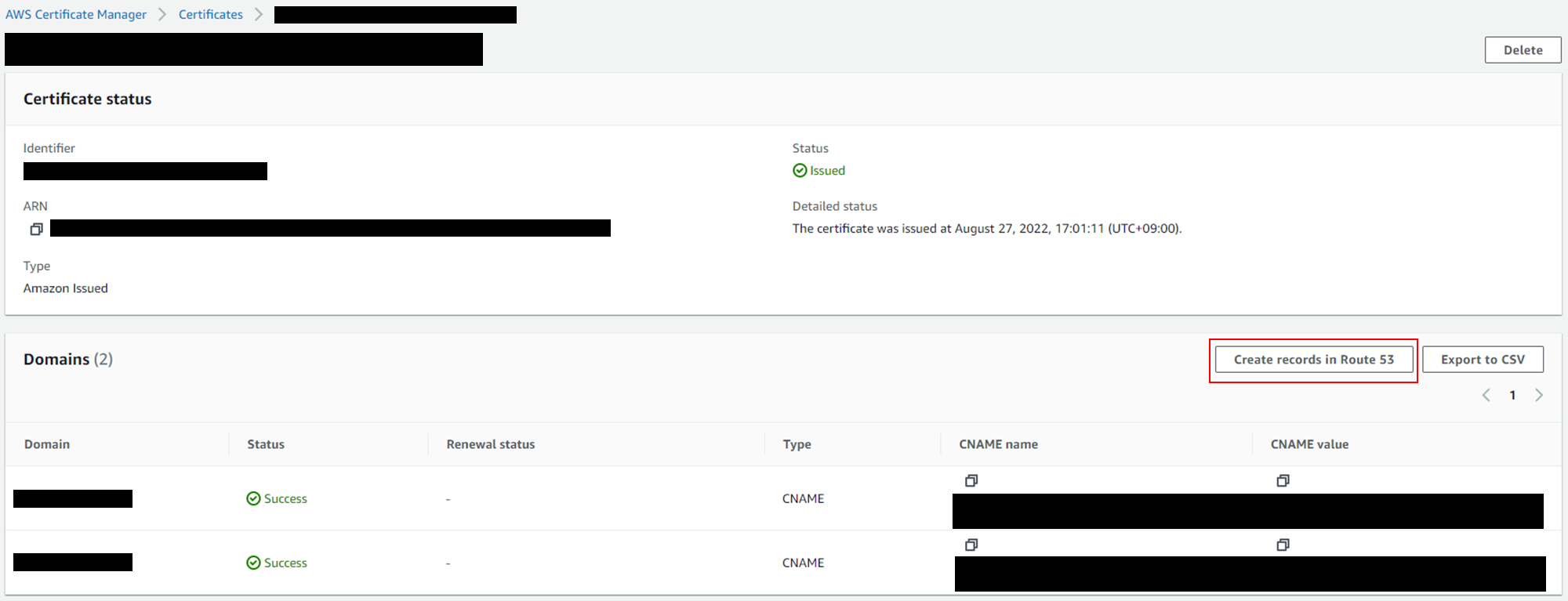 - DNS인증으로 하였을 경우 붉은색으로 표시된 버튼(Create records in Route 53) 을 클릭합니다.