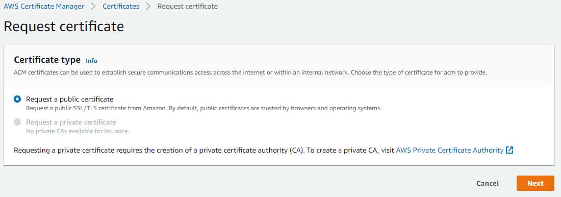 - Request a certificate를 클릭하여 새로운 인증서 발급을 시작합니다.