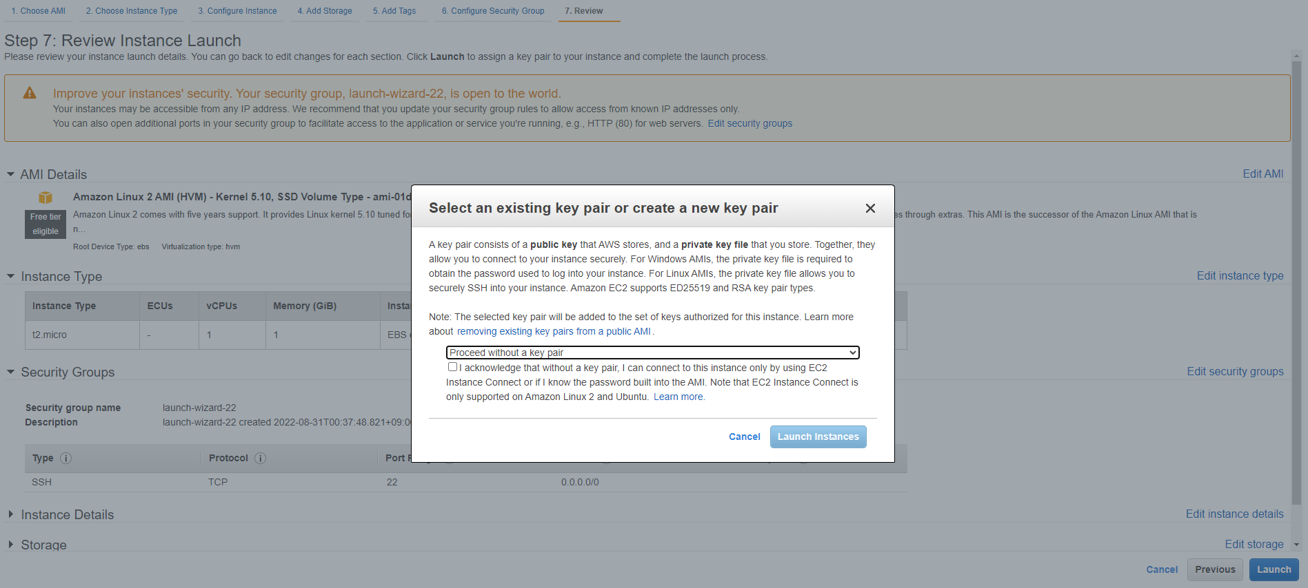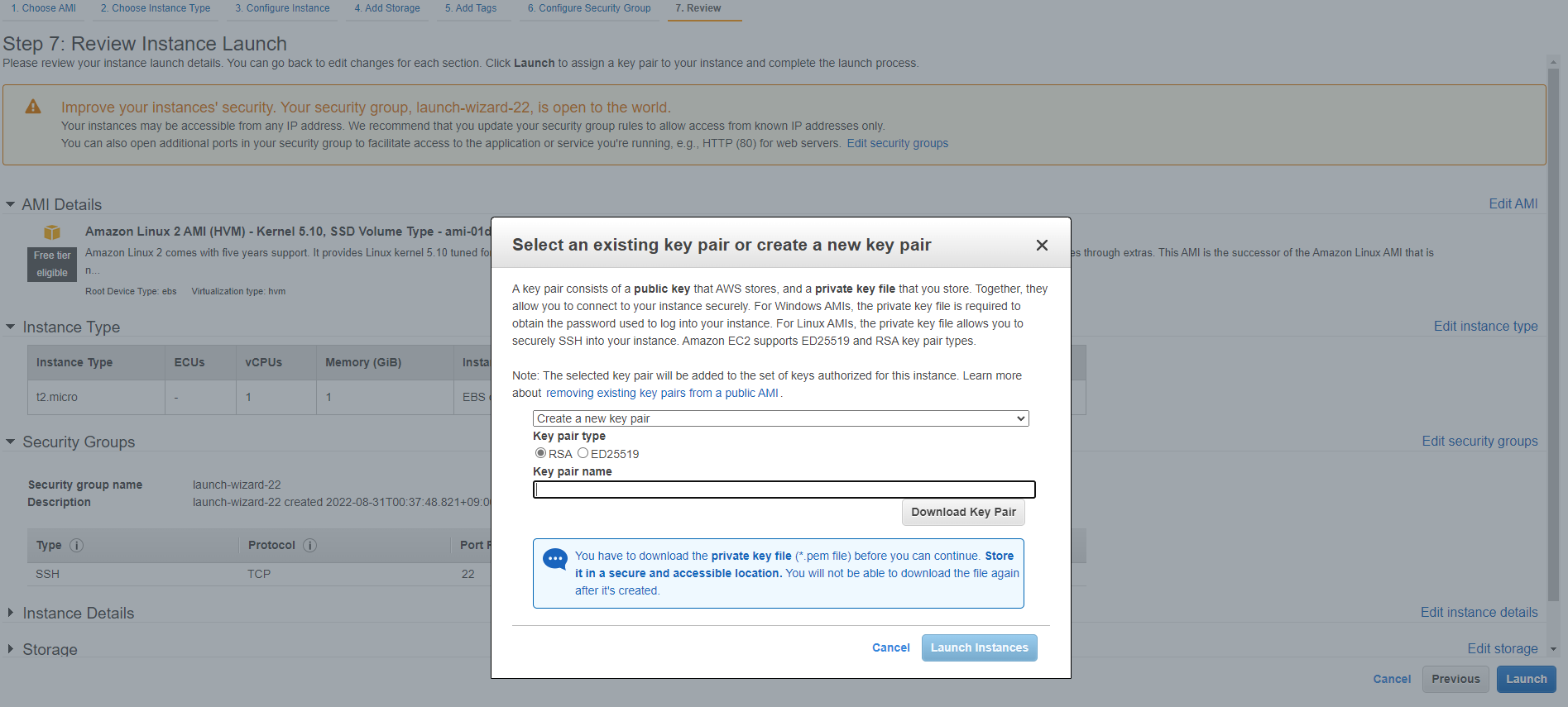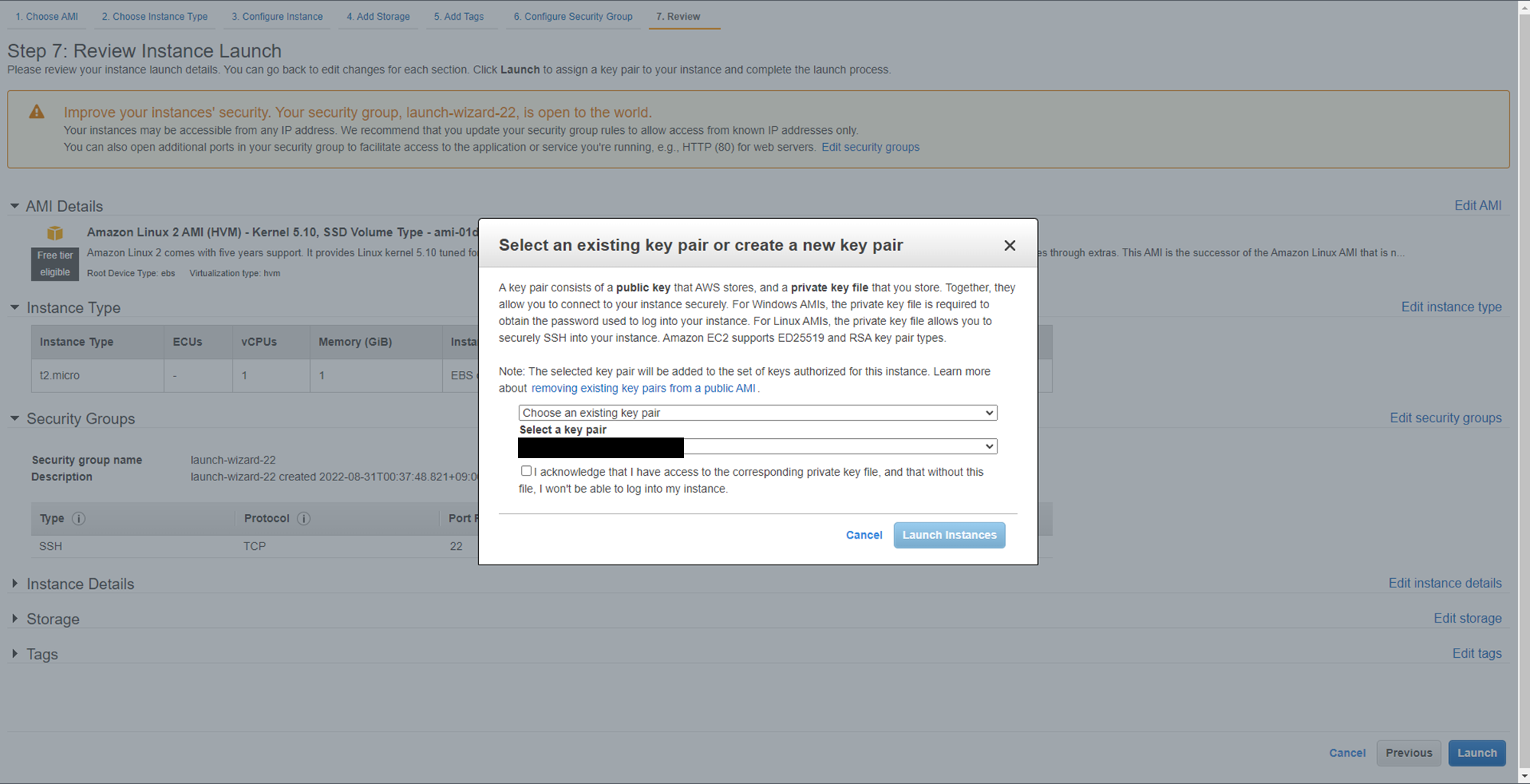 - 키페어를 설정한 후 Launch Instance를 선택하면 서버 생성이 완료됩니다.