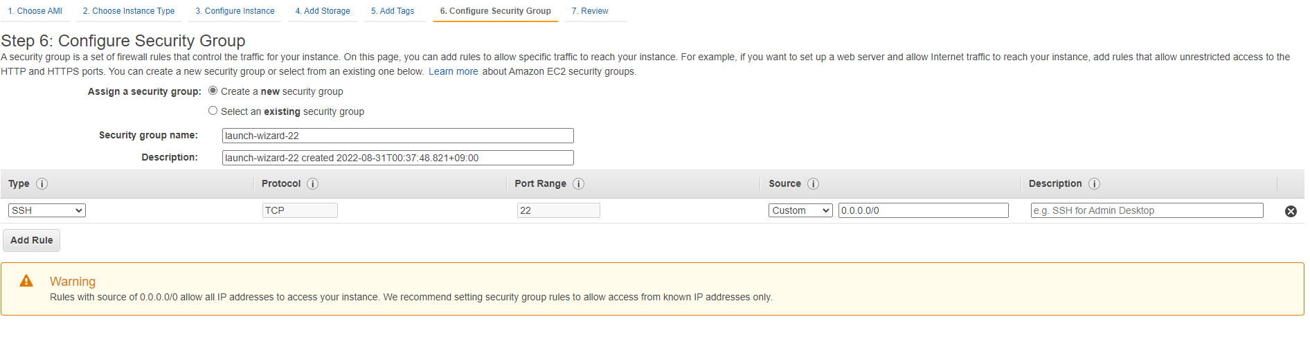 - 보안그룹을 설정합니다. 기존에 생성했던 보안그룹이 있을 경우 select를, 아닐 경우 create를 이용하여 생성합니다.