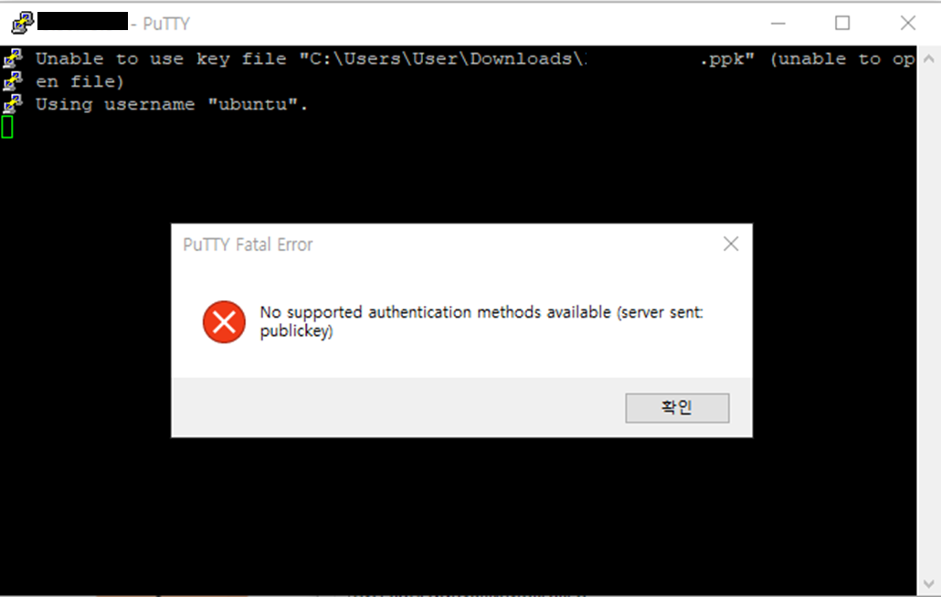 AWS EC2에서 우분투를 선택하여 인스턴스를 생성해았여나 아래와 같은 에러가 발생하면서 Putty를 사용하여 접속할 수 없었습니다.